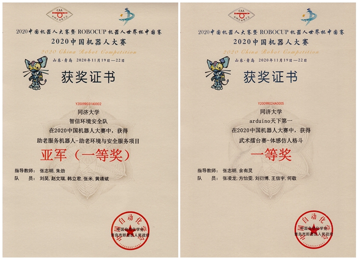 智信环境安全队参加助老服务机器人-助老环境与安全服务项目,获得亚军(一等奖),队员为刘昊(自动化)、赵文瑞(电气工程及其自动化)、韩立君(自动化)、张米(电气工程及其自动化)、黄靖斌(控制工程);极速远眺队参加武术擂台赛-视觉挑战A组项目,获得一等奖,队员为徐家富(电子科学与技术)、吴勇(自动化)、傅晟程(自动化)、王松森(计算机科学与技术)、肖宏远(控制科学与工程);arduino天下第一队参加武术擂台赛-体感仿人格斗项目,获得一等奖,队员为张凌龙(电子信息工程)、方怡雯(自动化)、刘衍博(电气工程及其自动化)、王信宇(信息安全)、何敬(自动化);智信robot队参加助老服务机器人-助老生活服务项目,获得优胜奖,队员为郭展羽(自动化)、赵师兵(自动化)、郑家齐(通信工程)、贺兰山(自动化)、黄鑫源(控制科学与工程);鬼谷子队参加医疗机器人-骨科手术机器人项目,获得亚军,队员为何子琦(自动化)、陈旭海(自动化)、陈豪(自动化)、沈隆琦(自动化)。