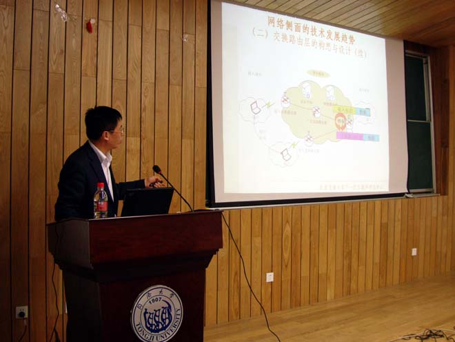 讲座中,张教授给与会师生介绍了国际领先的下一代国家骨干交换网络项目。该骨干网络项目是通过用户标识的应用,以实现下一代广播电视网、移动通信网和电信交换网的主干网络整合,以期未来实现低成本、高效率、安全有效的骨干核心层铺设。讲座之后,他还针对同学们的提问做了详细的解答。