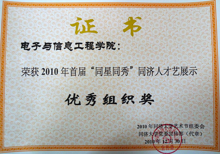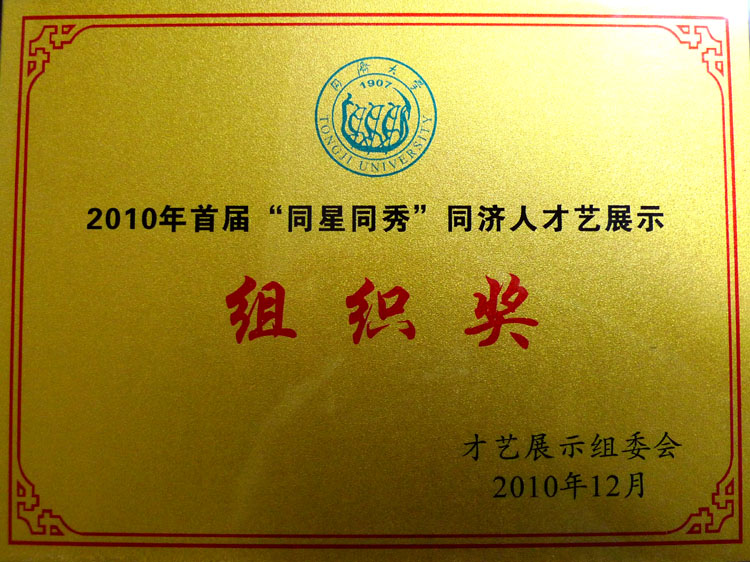 与建筑与城市规划学院、土木工程学院、经济与管理学院、电影学院、外国语学院、附属同济医院、体育部、上海同济科技实业股份有限公司、建筑设计研究院等10家单位获首届“同星同秀”同济人才艺大赛优秀组织奖。