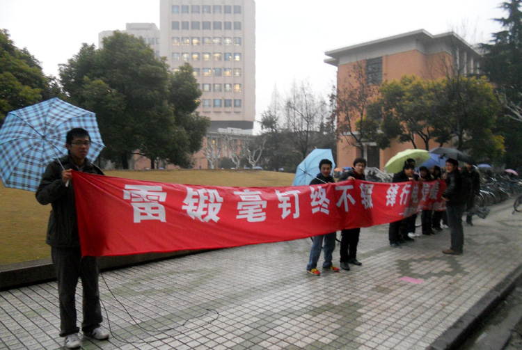 虽然天空中下着淅淅沥沥的小雨,但是同学们仍然纷纷停下匆忙的脚步,认真阅读了“学习和发扬雷锋精神的倡议书”,并在“雷锻毫钉终不辍 锋行电信暖人心”的横幅上郑重签下自己的名字,表明雷锋精神永驻于青年学子心中。(沈丽雯 林秋琴)