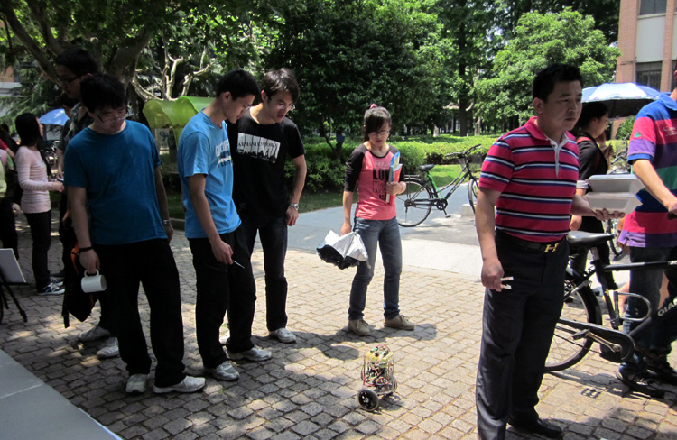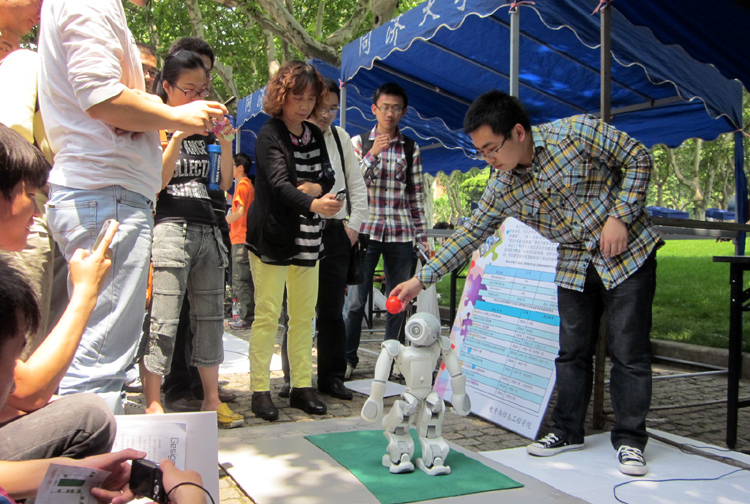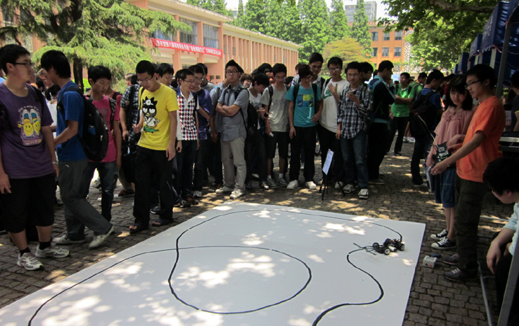 的“NAO机器人”、自动循迹小车、两腿自平衡机器人以及“秀友”移动交互平台作品,吸引了广大学生和校友的围观,特别是机器人与观众的精彩互动,以及小车的出色表演,赢得了观众的阵阵掌声。