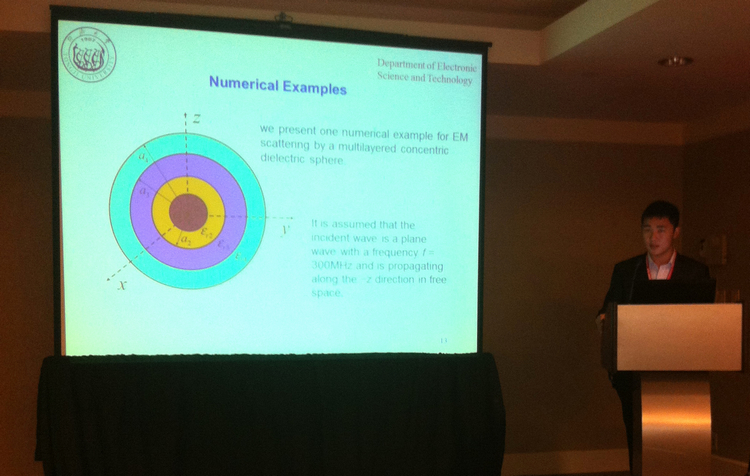 电子科学与技术系10级本科生张杰受邀参加在美国佛罗里达州奥兰多市举办的国际顶级学术会议“2013 IEEE International Symposium on Antennas and Propagation and USNC/URSI National Radio Science Meeting(2013年IEEE 天线与传播国际论坛暨国际无线电联盟美国国家委员会无线电科学会议)”,他在“复杂电磁问题的积分方程离散化与解法”分会场作了题为“A Point-Matching Method for Solving Volume Integral Equations with Inhomogeneous Media”的大会口头报告,受到与会代表好评,被国际最著名教授之一、美国工程院院士W. C. Chew教授誉为“very interesting work”。该论文是张杰和其他三位同学在系主任童美松教授指导下完成并在今年一月份投稿、三月份正式接受的。
