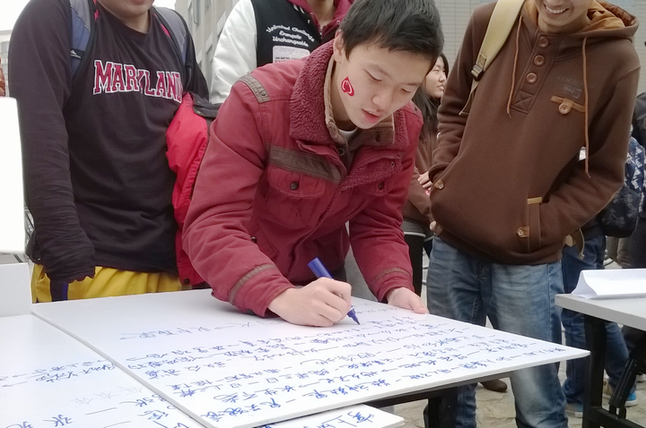 志愿服务活动内容以展板的形式进行展示,路过的同学将自己对志愿者们想说的话以留言的方式写在纸上,粘到展板上;同时,同学们还参加了成语接龙等小游戏,现场气氛活跃。