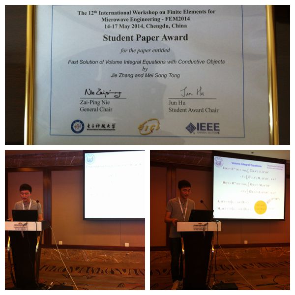 电子科学与技术系10级本科生张杰同学受邀参加在成都举办的国际著名学术会议“The 12th International Workshop on Finite Elements for Microwave Engineering”(第12届微波工程有限元国际研讨会)”,他在“矩量法与积分方程解器”分会场作了题为“Fast Solutions of Electromagnetic Volume Integral Equations with Conductive Media(导电性介质电磁体积分方程的快速解)”的大会口头报告,受到与会代表的好评,事后被多位国际著名教授誉为“good job”。该论文是张杰同学在系主任童美松教授精心指导下完成并在今年一月份投稿、三月份正式接受的。会上大会技术委员会成员根据论文内容和口头报告质量进行打分评审,最终该论文被评为最佳论文之一。
