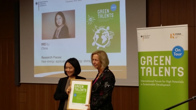 “绿色精英奖”由德国德国联邦教育和科研部于2009年发起,旨在奖励活跃于可持续发展领域的杰出青年科学家。今年的第六届“绿色精英奖”由专家评审委员会从来自100多个国家和地区的800多份申请中评选而出。在2014年评选出的25名“绿色精英奖”获奖者中韦莉博士是国内各高校中唯一获奖的在职青年教师,2014年11月7日德国联邦教育和科研部部长约翰娜・万卡出席颁奖仪式并为获奖者颁奖。