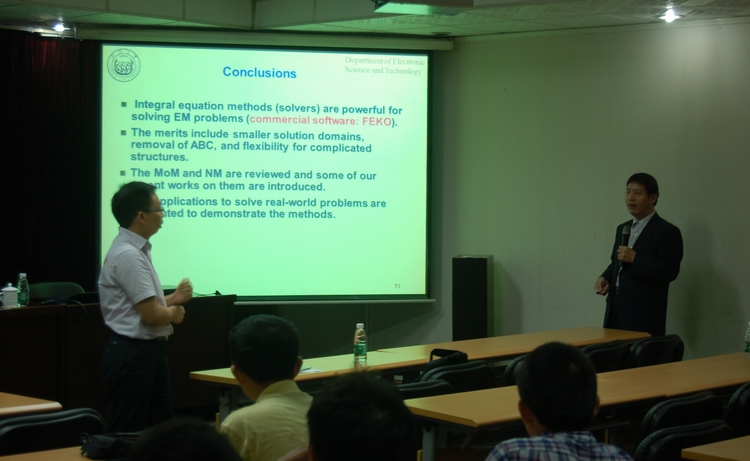 期间,童美松教授受到了学院分管科研的季飞副院长的接见,双方表达了在相关领域加强科研合作与交流的强烈愿望。随后童美松教授应邀为相关领域的师生作了一场题为“现实中极具挑战性电磁学问题的积分方程解法”的公开学术报告,受到师生的欢迎。报告着重介绍了童美松教授团队近几年的研究成果,特别是一些既简单有效又快速精确的复杂电磁积分方程数值解法以及它们在求解现实世界中极具挑战性电磁学问题中的应用,比如飞机电磁散射、雷达目标探测、卫星天线设计、芯片电子封装、电磁兼容分析等,引起了在场师生的强烈兴趣并做了充分的交流与互动。
