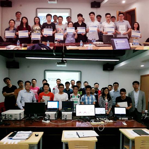 5月6日下午,在赵阳与曹行两位工程师的指导下,师生们开始了基于USRP RIO硬件平台的动手实验。伴随着两位工程师耐心细致的讲解,师生们相继完成了包括FM解调、FM收音机测试、创建OFDM调制器、浮点转定点四项实验。整个动手实验期间,不时有同学就实验所发现的问题向NI工程师请教并提出自己的想法,并与NI工程师共同解决问题。通过实验,同学们进一步体会到USRP硬件平台功能的强大以及LabVIEW Communication软件系统开发的便捷性。最后曹行工程师还鼓励同学们认真学习Labview开发软件,并将其运用到自身研究的课题领域中去,为科研献上自己的一份力量。在课程的最后,所有参与到此次培训课程中的师生均获得了由NI工程师颁发的资格证书,并进行合影留念。(黄新林)