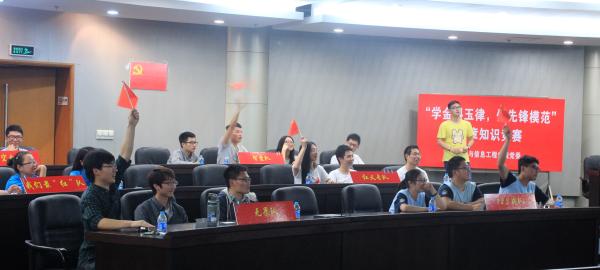 为深入学习贯彻习近平总书记系列重要讲话精神,响应党中央对于青年学生学习党章、遵守党规,增强党性修养,做合格党员的号召,进一步推动“两学一做”学习教育的深入开展,5月24日下午,学院党委在嘉定校区同心楼124室成功举办了“学金科玉律,做先锋模范”党章知识竞赛活动。校党委研究生工作部副部长宋木生、学院党委副书记董变林、学院计算机联合党总支副书记张砚秋、电气信通联合党总支副书记张明锐出席了竞赛现场,来自学院四个总支的党员组成的八支参赛队参加了本次比赛。