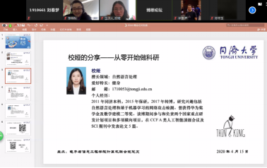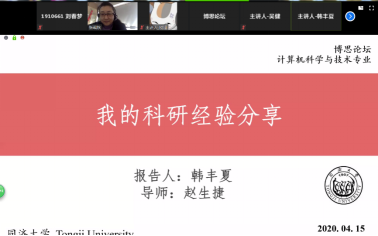 2020年4月15日下午2点,由学院计算机联合党总支主办2019级计算机博士班协办的“你离博士毕业还有多远”在线博思论坛在zoom平台举行。论坛特邀三位刚毕业的博士生校娅、吴健和韩丰夏与大家分享交流。学院副院长尹学锋教授、计算机系主任丁志军教授和计算机联合党总支副书记张砚秋老师出席了论坛,论坛由19级博士生王瑞主持,共有60余名博士生参加了此次论坛活动。