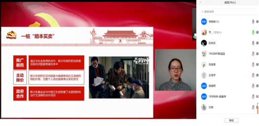 在《新药的故事》之我想-感悟分享环节,第四小组的成员分享了读书心得。同学们纷纷表示,读完这本书,深刻地感受到新药研发的不易……如今,面对新型冠状病毒这个全人类共同的敌人,全球多个国家争分夺秒研发疫苗。中国多款新冠肺炎疫苗进入临床二期,在临床试验上持续领跑全球。令人敬佩的,有夜以继日开展科研攻关的药物研发人员,还有愿意冒着风险给后来者探路的Ⅰ期、Ⅱ期临床试验志愿者们,他们,是亿万人民群众的英雄!通过阅读《新药的故事》并结合疫情中新冠病毒疫苗的研发,同学们进一步了解了新药和疫苗研发的过程,不仅需要国家和企业的大力投入,也需要研发人员坚持不懈的科研精神。研发新药的出发点,不是利润,而应是以人为本、救死扶伤的社会责任感。正如钟南山教授所言,“只要是老百姓急需的药物,哪怕价格低,甚至没有利润,都要研发!” 新冠肺炎疫情发生以来,党中央、国务院高度重视,在加强疫情防控的同时迅速启动疫苗研发计划,这一系列以人民为中心的方案和措施,进一步增强了同学们的道路自信和制度自信。
