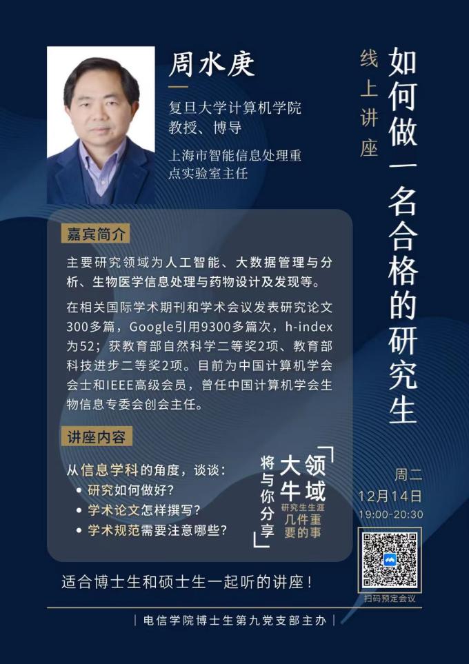 2021年12月14日晚7点,由学院学生党委博士生第九党支部主办的“如何做一名合格的研究生”科研讲座在腾讯会议线上举行。本次讲座特邀复旦大学计算机学院周水庚教授主讲,支部书记张砚秋老师主持本次活动。本次讲座共有近四十位硕博研究生在线参加,时长约2个小时。