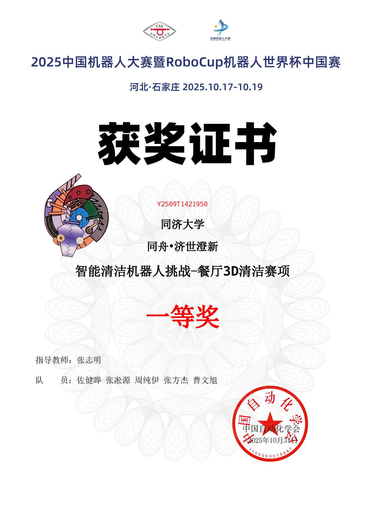人工智能+机器人竞赛TJSRCLAB实验室,派出的四支队伍同样以电信学院学生为骨干,汇聚了四个学院的优秀学子。团队在控制系张志明、工程实践中心杨晓圆及控制系朱劲老师指导下,由张旭磊(自动化)辅助管理,在四个赛项中均取得突破:同舟•济世澄新队斩获智能清洁机器人挑战-餐厅3D清洁赛项全国一等奖,队长为佐健晔(自动化),队员包括张凇源(自动化)、周纯伊(中德工程学院/机械电子工程)、张方杰(控制科学与工程)、曹文旭(电子信息);智信•Hawkeye队伍获机器人先进视觉赛3D识别赛项全国二等奖,队长为陈婉琳(自动化),队员包括王潇扬(计算机科学与技术学院/计算机科学与技术)、王星达(微电子科学与工程)、汤睿晨(自动化)、张慧(微电子科学与工程);智信•侦防先锋队伍获公共安全侦查机器人赛项全国三等奖,队长为吴佳佳(通信工程),队员包括张亦弛(电气工程及其自动化)、霍睿(通信工程)、谢承兴(人工智能);同舟共济队获武术擂台赛仿人格斗赛项全国三等奖,队长为宗慕雪(电气工程及其自动化),队员包括陆欣蕊(电气工程及其自动化)、史艺雯(土木工程学院/智能建造)。