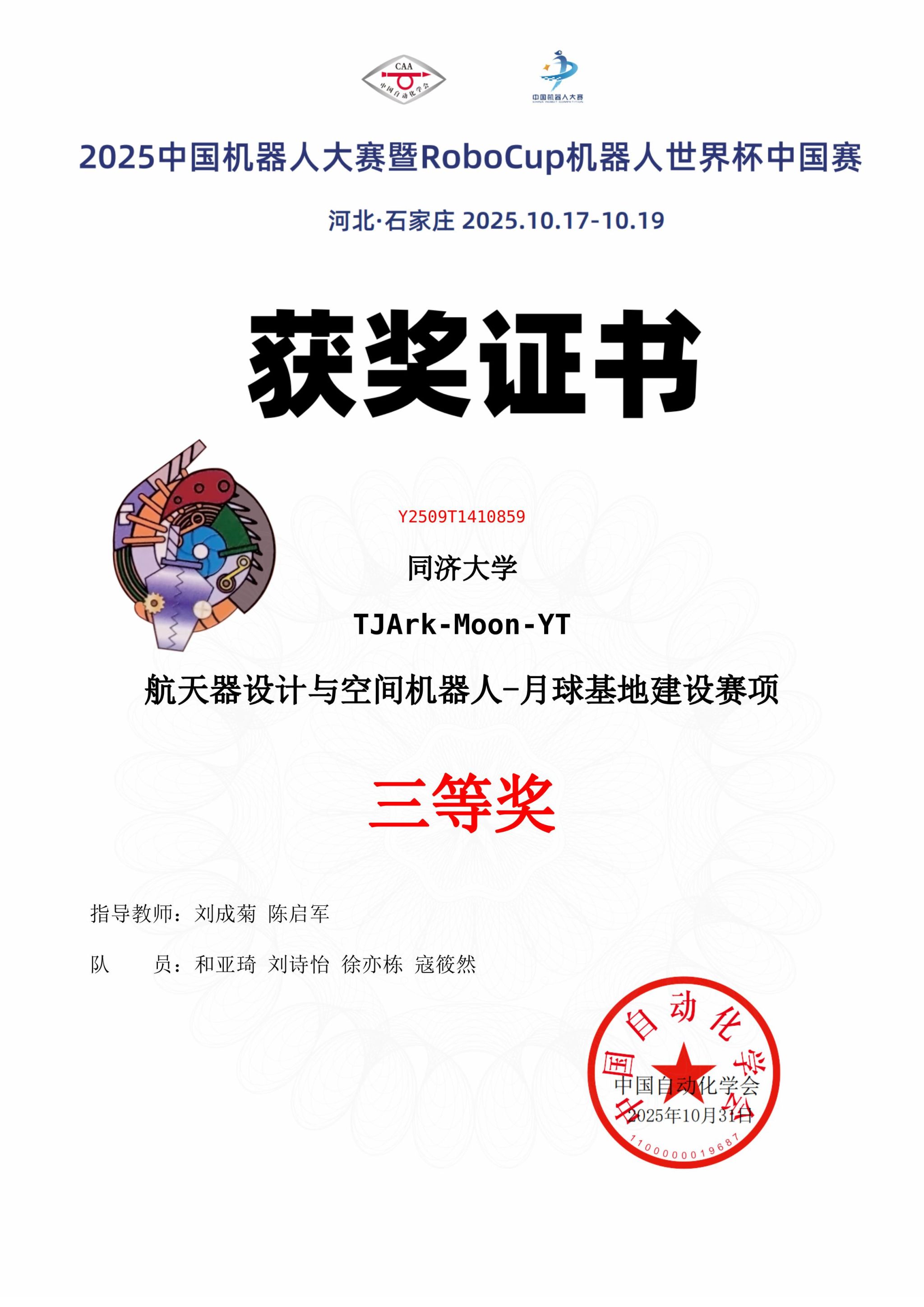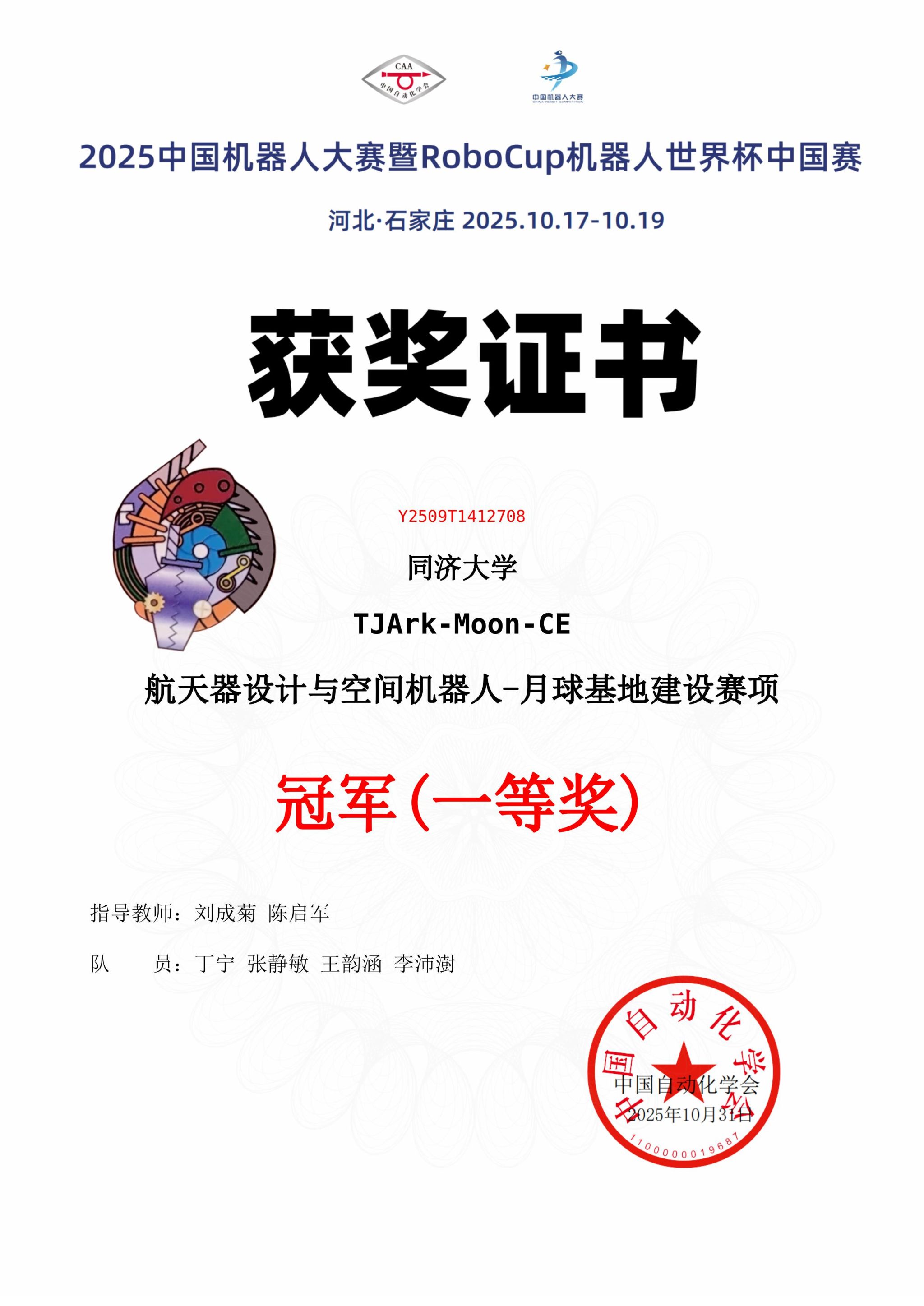 机器人与人工智能实验室TJArk团队派出的两支队伍表现优异。该团队以电信学院学生为主,汇聚了三个学院的优秀学子,由控制系陈启军、刘成菊老师指导,并由学生罗烨(自动化)、任筱舒(人工智能)及张旭晖(控制科学与工程)辅助管理。其中,TJArk-Moon-CE队勇夺全国冠军(全国一等奖),队长为丁宁(人工智能),队员包括张静敏(计算机科学与技术学院/数据科学与大数据技术)、王韵涵(计算机科学与技术学院/计算机科学与技术)、李沛澍(国豪书院/微电子科学与工程);TJArk-Moon-YT队获全国三等奖,队长为和亚琦(计算机科学与技术学院/计算机科学与技术),队员包括刘诗怡(计算机科学与技术学院/数据科学与大数据技术)、徐亦栋(自动化)、寇筱然(电气工程及其自动化)。